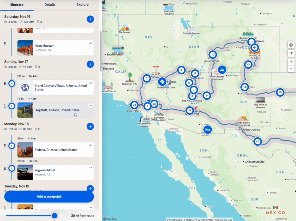 Hey there! If you’re using the Roadtrippers website, you can rearrange waypoints by clicking the dots to the left of a waypoint, then dragging and dropping it to a new position in the list.